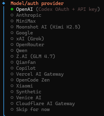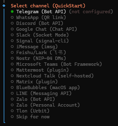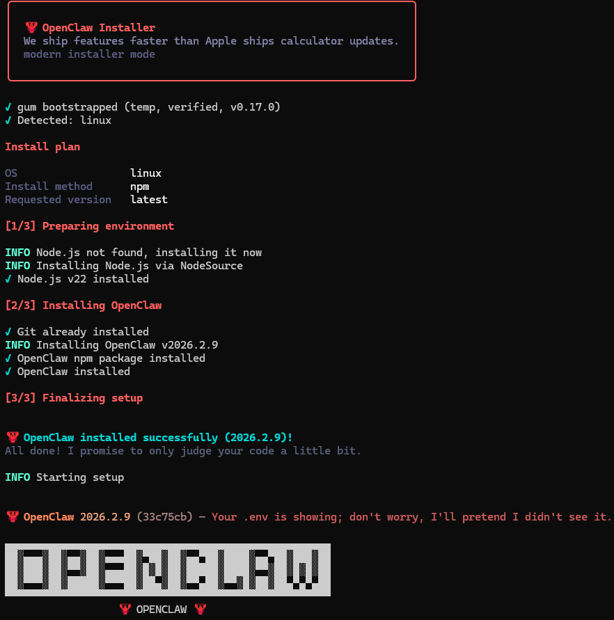After installation, OpenClaw will start an interactive setup in the terminal (TUI mode).