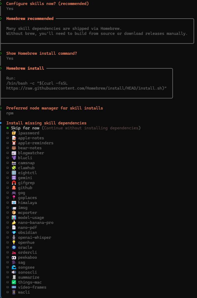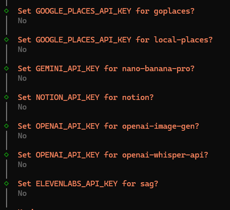OpenClaw may ask for additional third‑party API keys. If you do not have any: Select No to skip each option.