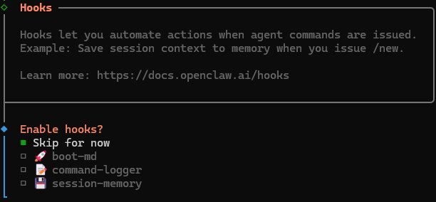For initial setup, you may select Skip for now. Hooks can be enabled later through configuration.
