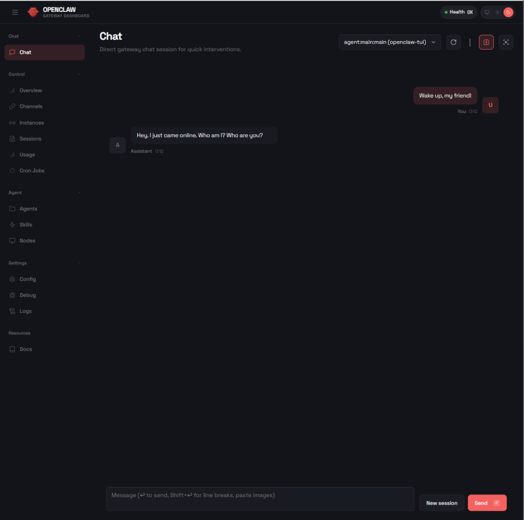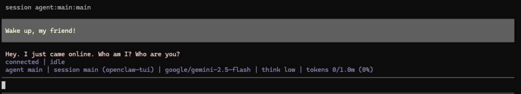 After setup is complete, OpenClaw launches its TUI (Terminal User Interface).
