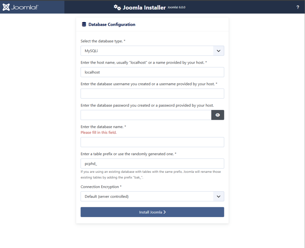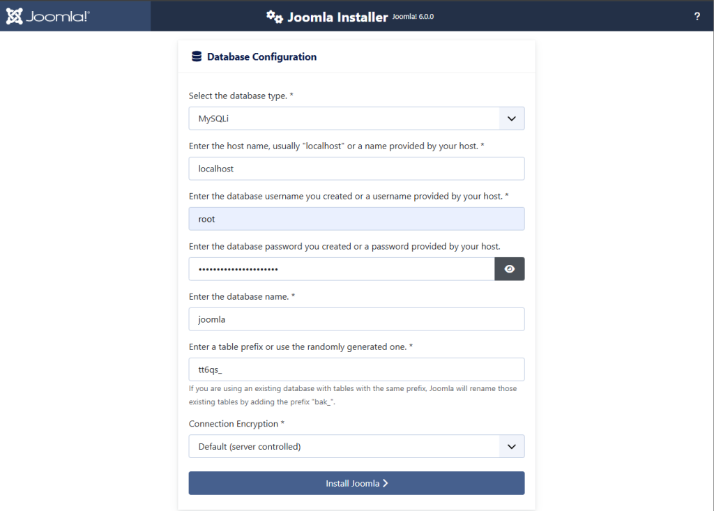 Hostname will be localhost Database username will be root Database name will be joomla Database password will be the one above